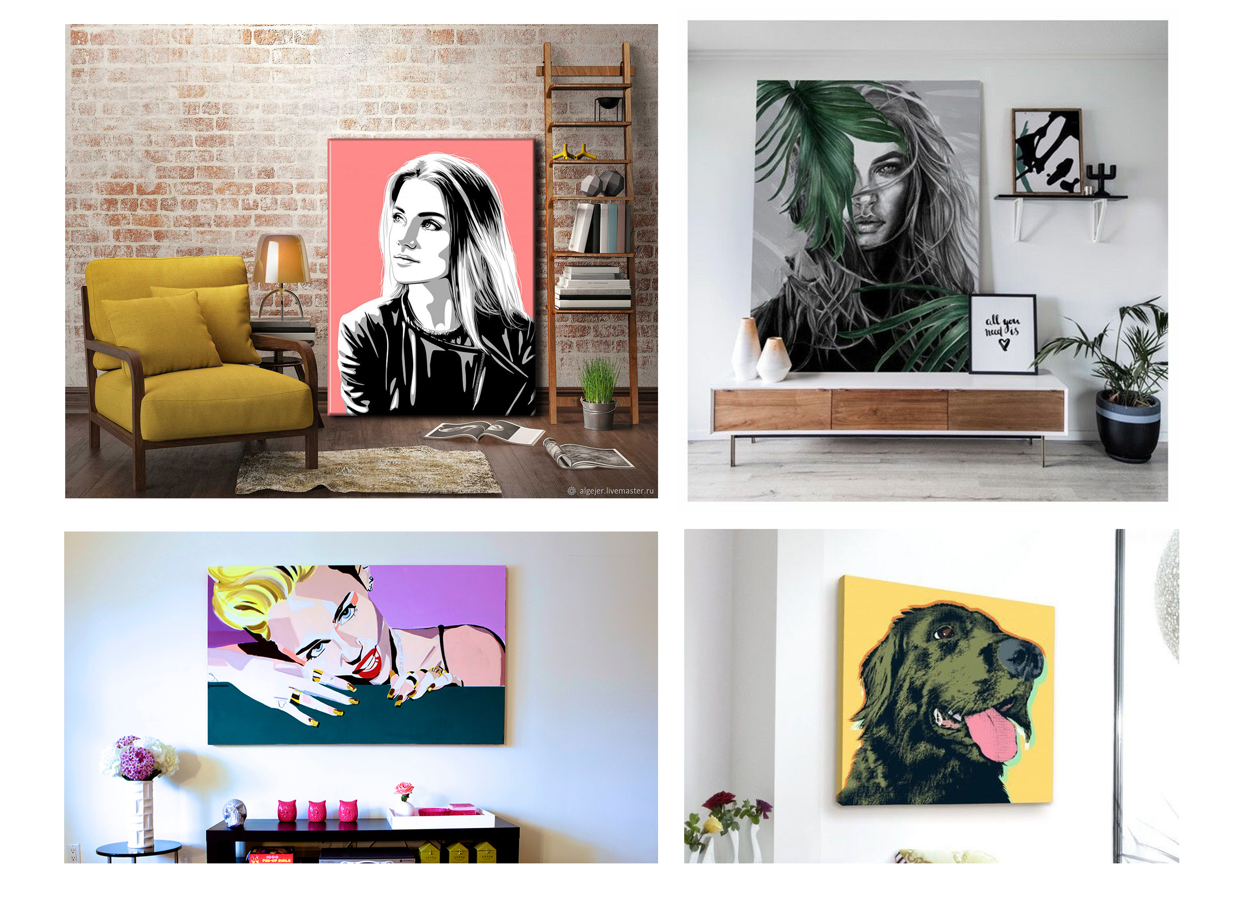 - Поп-арт картины. Мы поможем вам нарисовать потрет любого человека в стиле поп—арт, а потом на печатать его на холсте. Стоимость дизайн-макета: 20 руб. и выше (от сложности).