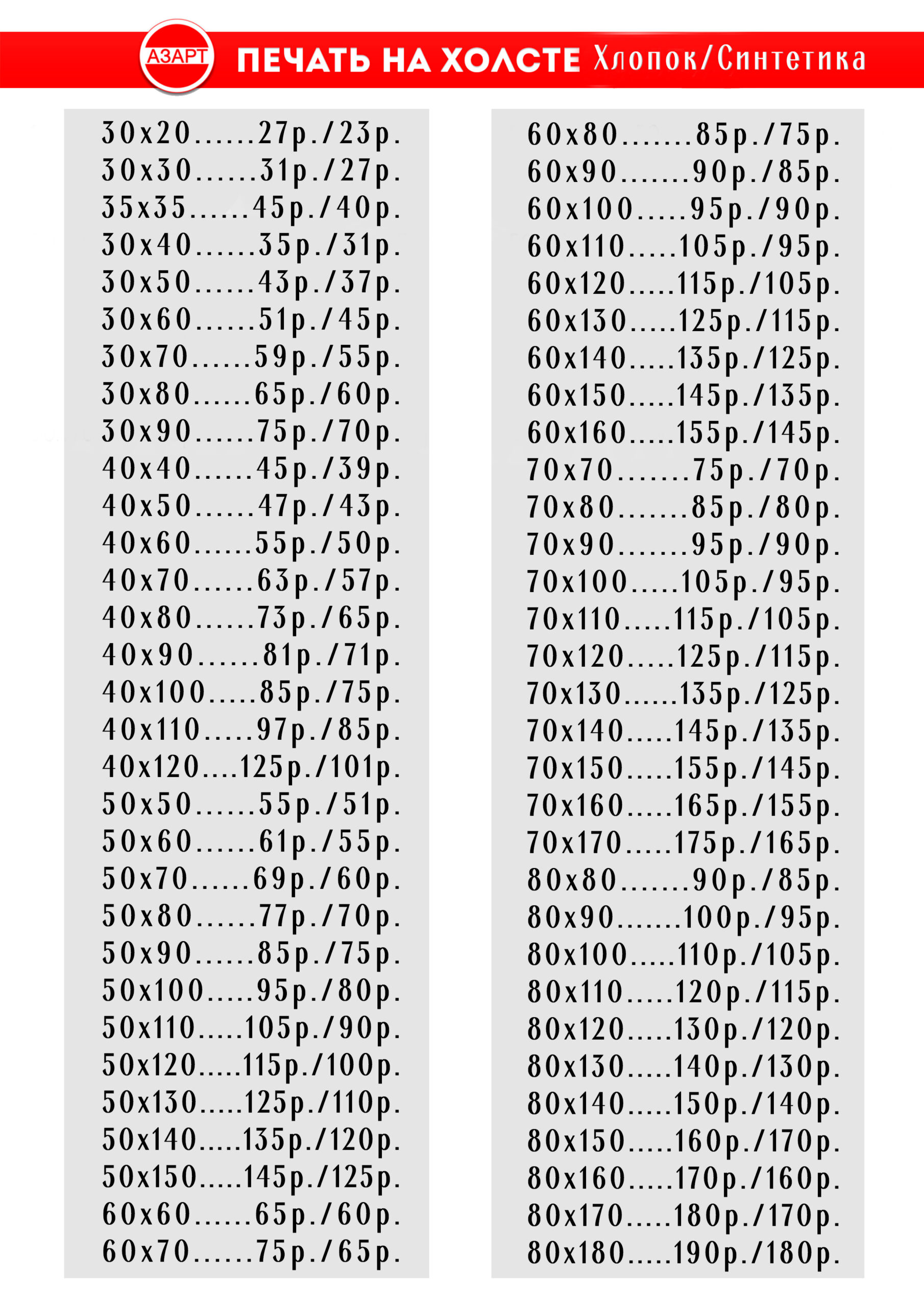 Прайс на печать холста (хлопок/синтетика) с подрамой смотрите ниже: